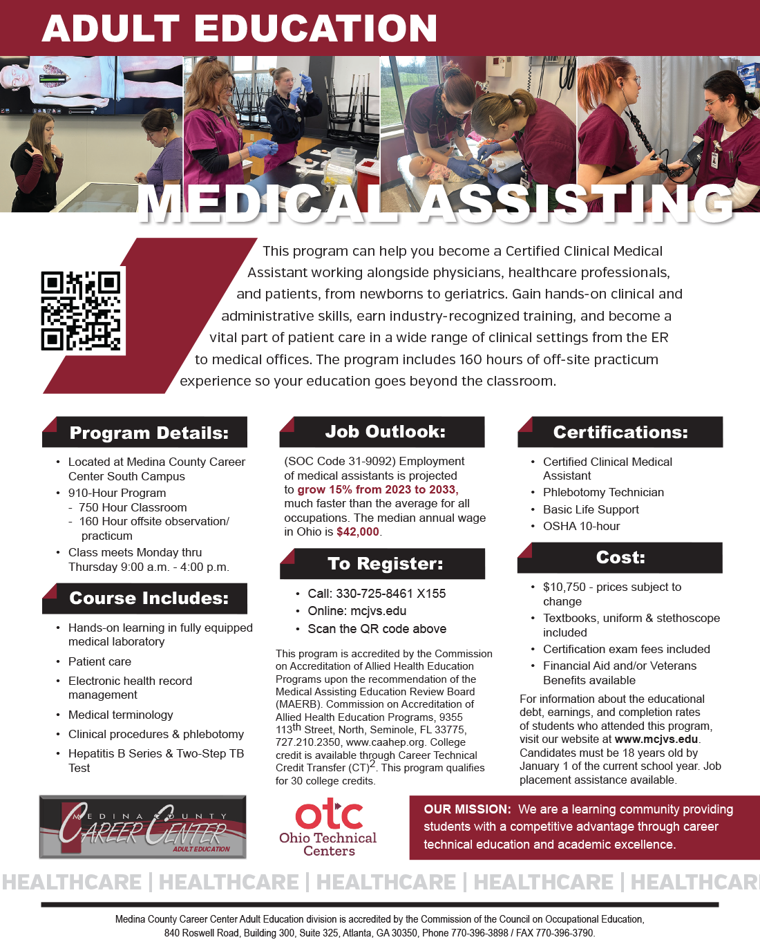 The Medina County Career Center Medical Assisting program is accredited by the Commission on Accreditation of Allied Health Education Programs (www.caahep.org) upon the recommendation of the Medical Assisting Education Review Board (MAERB)