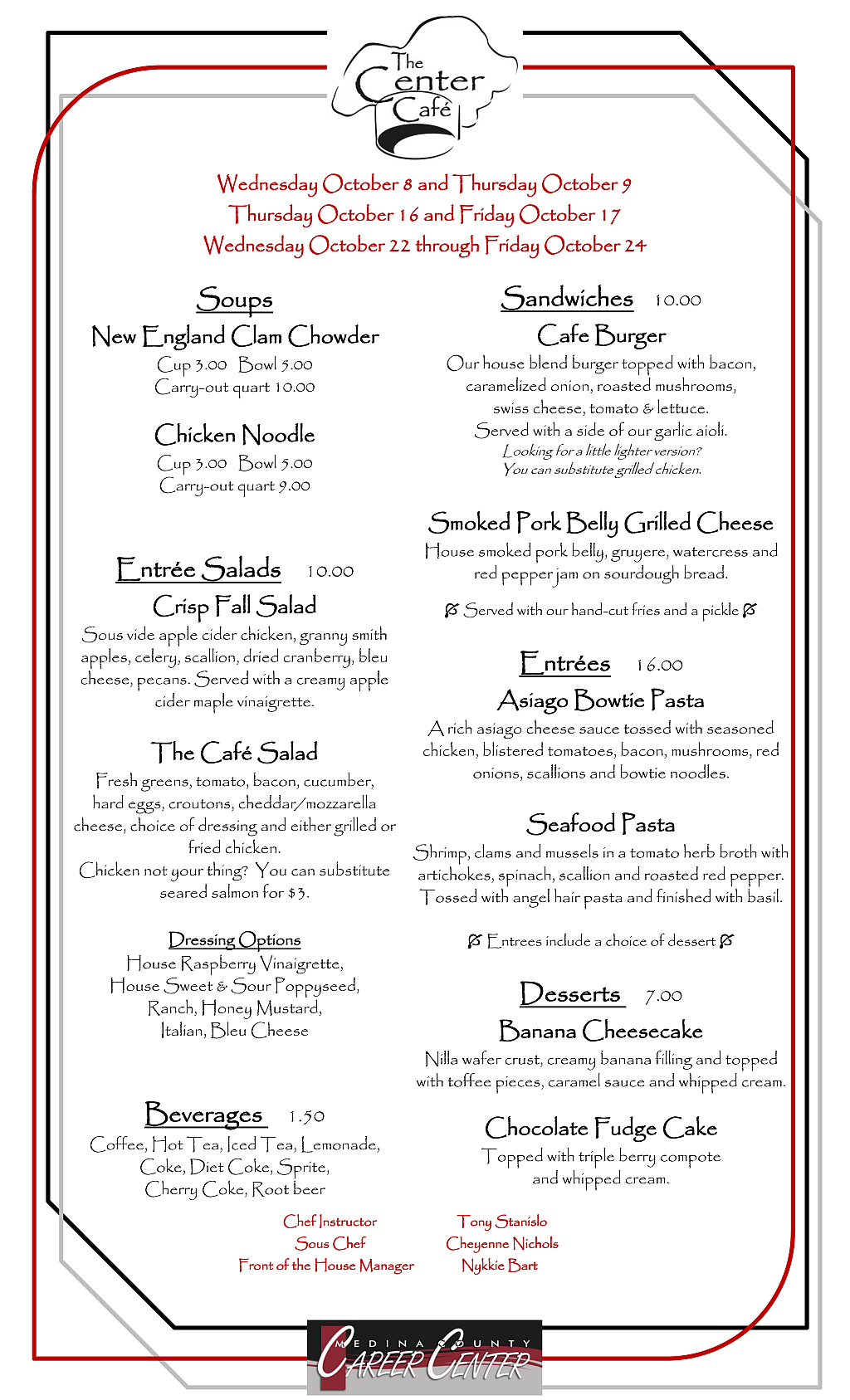 Reservations: While reservations are strongly suggested for smaller parties, groups of 6 or more are required to make reservations. Please call the direct line at 330-721-0229 or email Chef Tony at tstanislo@mcjvs.edu for reservation requests with at least 48 hour notice.